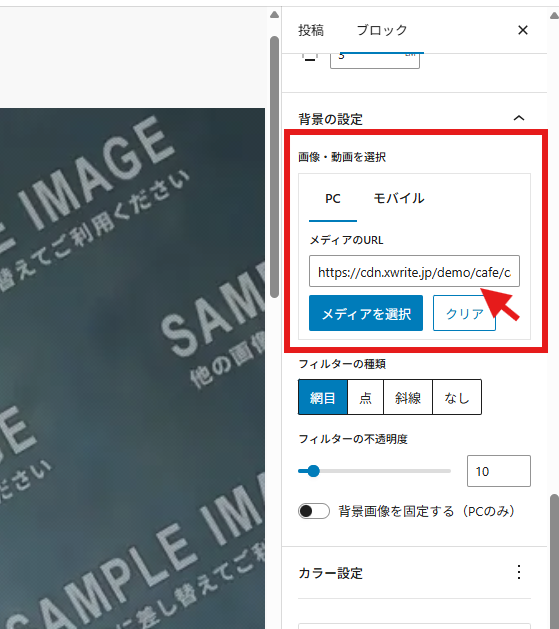 「SAMPLE IMAGE」と記載のある背景画像を変更したいということでよろしいでしょうか。