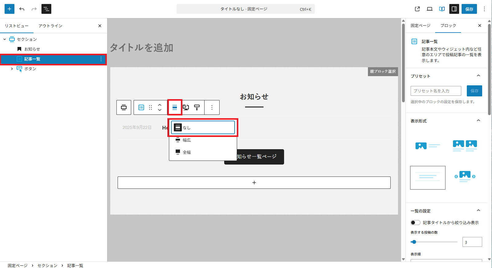- 「記事一覧」ブロックの幅設定「全幅」を「なし」に変更して保存