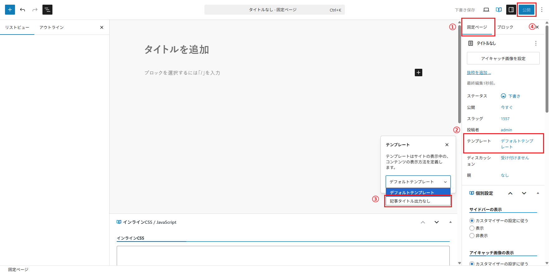 ※通常の「投稿」で「記事タイトル出力なし」を選択することはできません(そもそも「テンプレート」選択ができません)。
