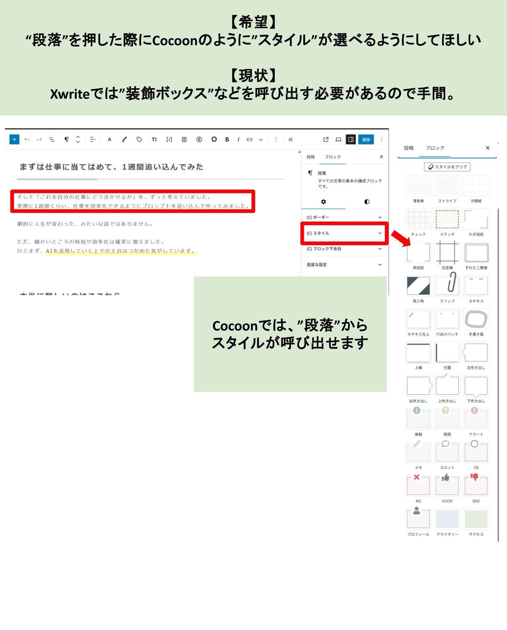 Xwriteでは都度、装飾ボックスを呼び出す必要があるため、手間に感じております。