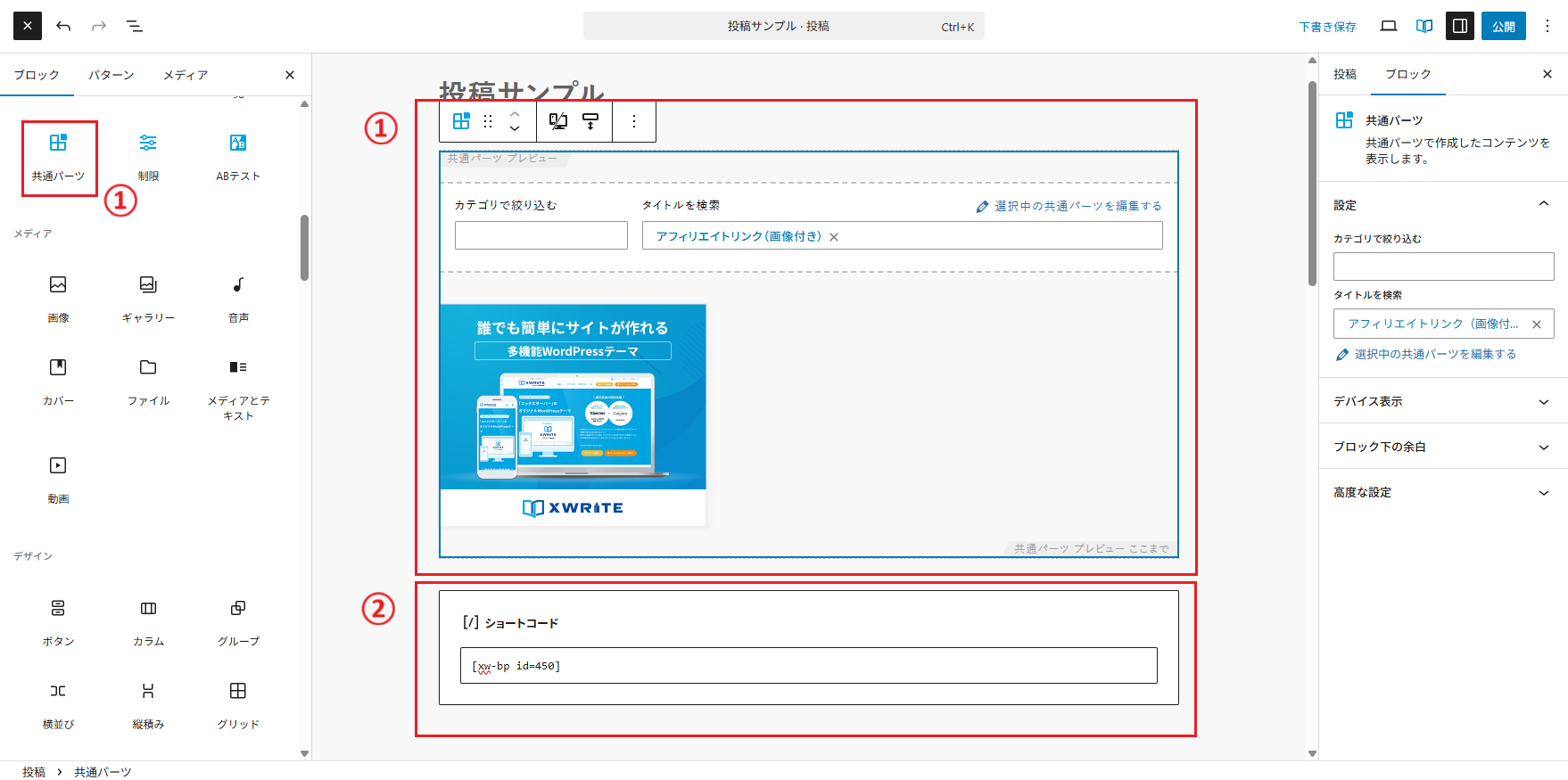 「共通パーツブロック(添付画像①)」または「ショートコード(添付画像②)」
