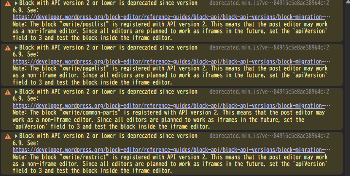 現状、Xwriteの独自ブロックの多くがdeprecatedとなっており、WordPress 7.0以降にアップデート時にブロックエディターの動作不良が生じる可能性があります。